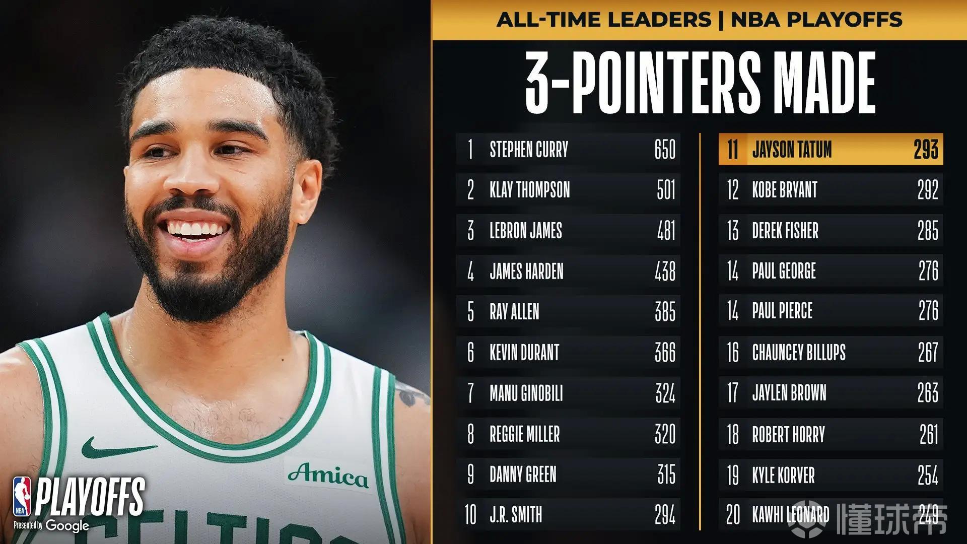 超越偶像科比,塔图姆季后赛三分球命中总数升至历史第11位