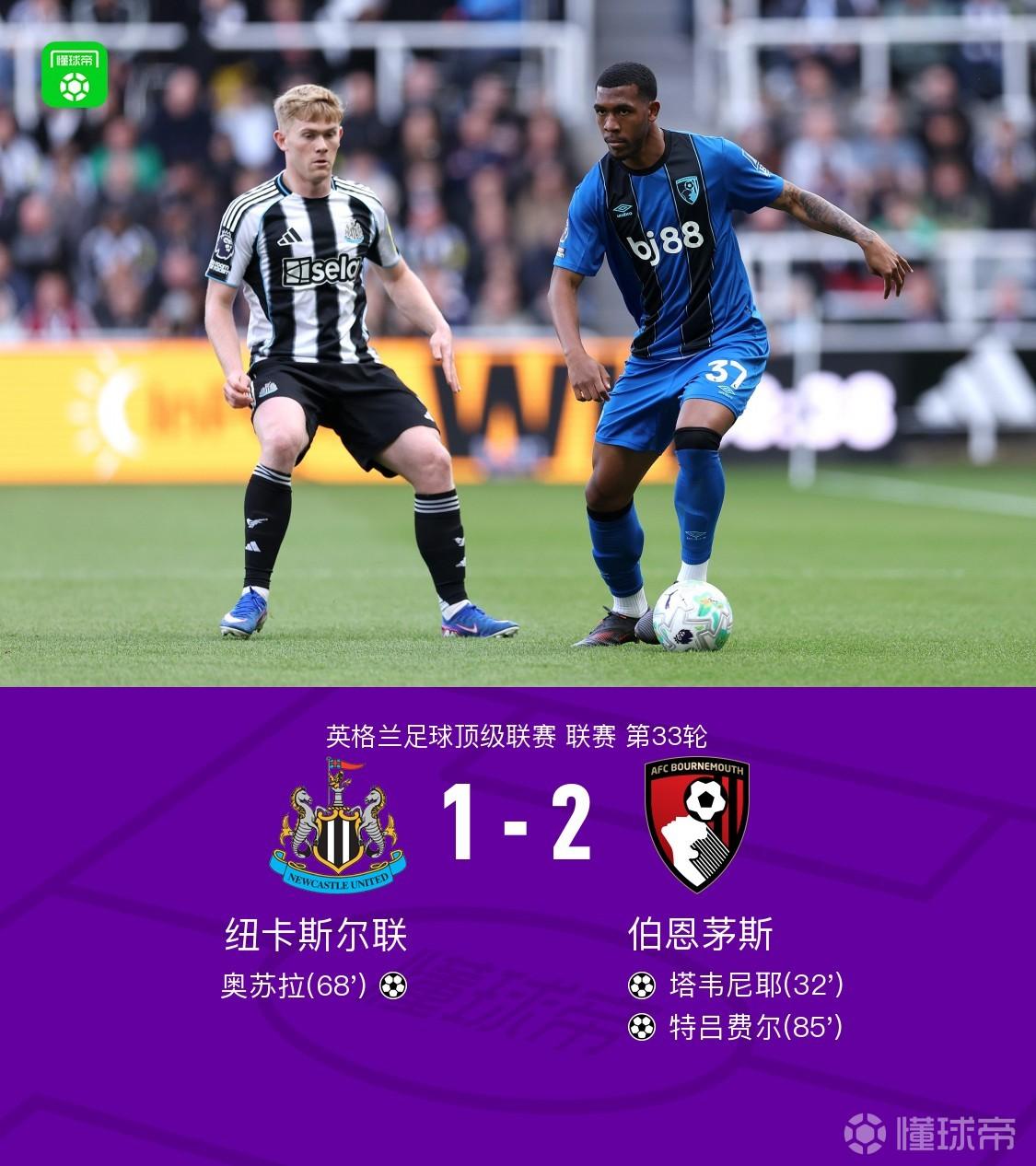 纽卡1-2伯恩茅斯,埃万尼尔松乌龙回传+头球助攻,特吕费尔绝杀