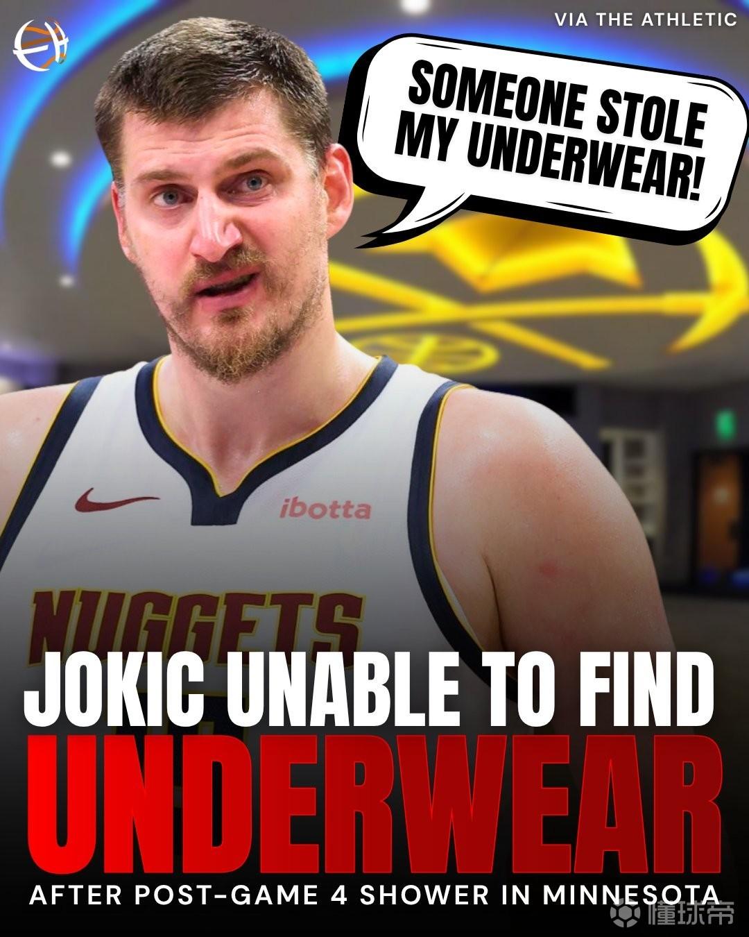 据TA记者Jason Quick报道,约基奇在比赛结束后立马去冲澡,但冲完澡后发现自己的内裤不见了,这令约基奇感到愤怒,约基奇在更衣室喊道:“有人偷了我的内裤!(someone stole my underwear)”