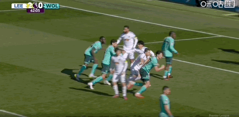 第13分钟,利兹联角球进攻罚到后点,勒温横传门前皮球贴着门线滑门而过