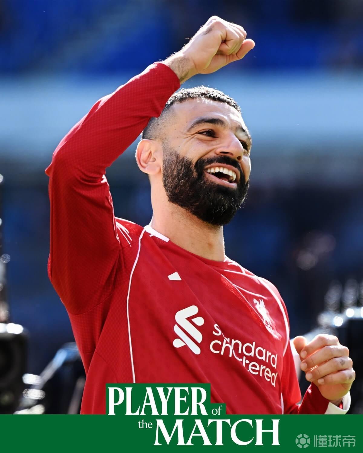英超第33轮,利物浦客场2-1击败埃弗顿,此役为红军首开记录的萨拉赫当选利物浦队内全场最佳球员。